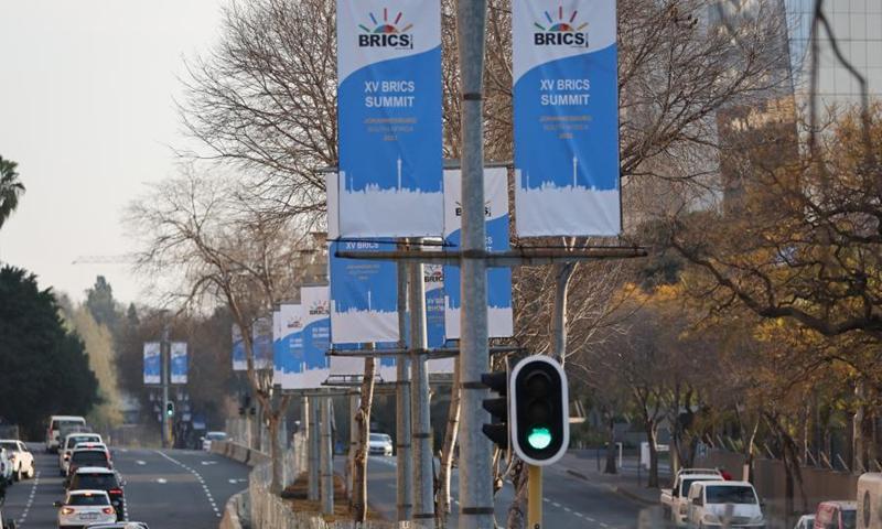 Carteles se han colocado en una calle para dar la bienvenida a la próxima cumbre de BRICS en Johannesburgo, Sudáfrica, el 20 de agosto de 2023. La 15ª cumbre de BRICS se llevará a cabo en Johannesburgo del 22 al 24 de agosto.