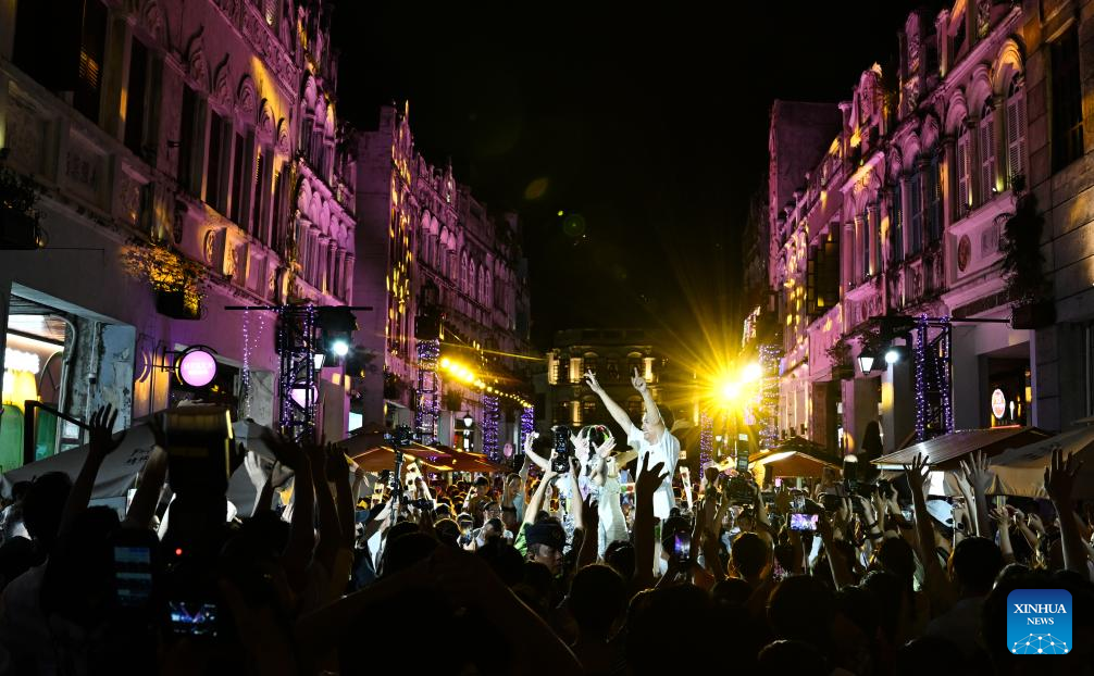 Los turistas observan una actuación en la antigua calle Qilou en Haikou, provincia de Hainan, sur de China, el 22 de agosto de 2023. Qilou, o casa porticada, se refiere a un edificio con una arcada frontal en su planta baja que permite el paso de peatones.
