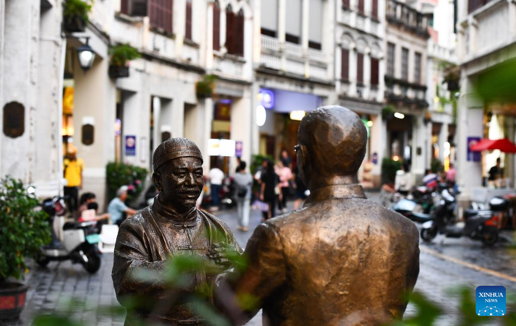 Estatuas en la antigua calle Qilou en Haikou, provincia de Hainan, sur de China, fotografiadas el 21 de agosto de 2023. Qilou, o casa porticada, se refiere a un edificio con una arcada frontal en su planta baja que permite el paso de peatones.