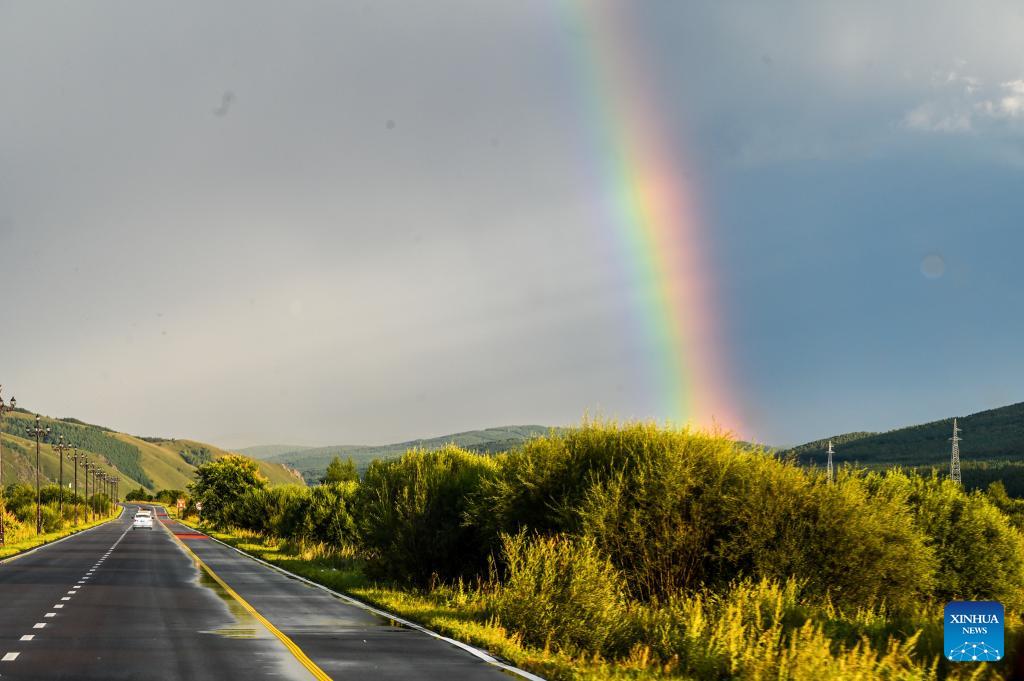 Esta foto tomada el 31 de agosto de 2023 muestra un paisaje coronado por un arco iris en Arxan, Liga Hinggan, en la región autónoma de Mongolia Interior, en el norte de China. Arxan, ubicado al pie suroeste de las montañas Dahinggan y en la intersección de cuatro pastizales principales, es un destino turístico cada vez más popular.