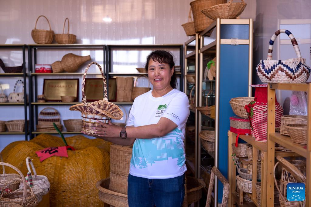 La aldeana Dong Yali muestra artículos de sauce en la aldea de Xikou en Arxan, Liga Hinggan, región autónoma de Mongolia Interior del norte de China, el 2 de septiembre de 2023. Arxan, ubicado al pie suroeste de las montañas Dahinggan y en la intersección de cuatro pastizales principales, es un destino turístico cada vez más popular.