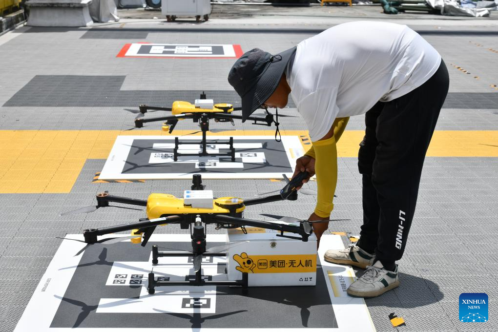 Un miembro del personal prepara drones de entrega de alimentos no tripulados en Shenzhen, provincia de Guangdong, sur de China, el 15 de agosto de 2023. En la Feria Internacional de Comercio de Servicios de China (CIFTIS) de este año, que se está llevando a cabo del 2 al 6 de septiembre en Beijing, se exhiben vehículos de entrega no tripulados y drones que reciben mucha atención.