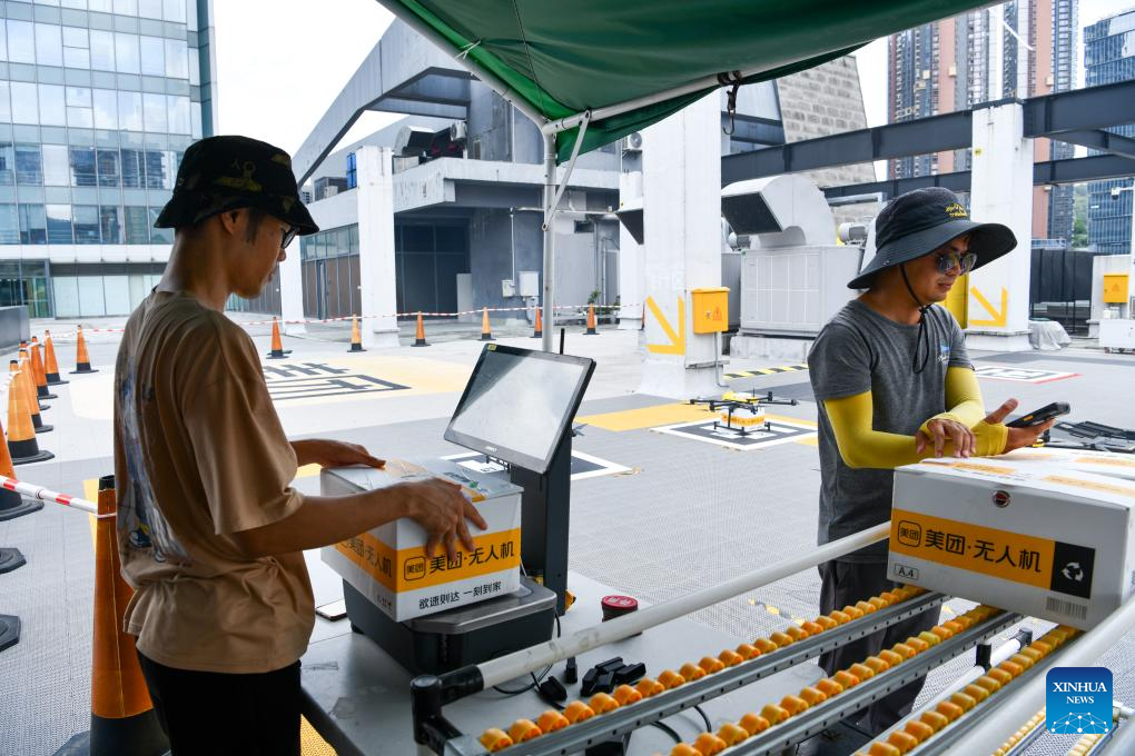Miembros del personal escanean cajas que contienen alimentos en un sitio de despegue de un dron no tripulado de entrega de alimentos en Shenzhen, provincia de Guangdong, sur de China, el 15 de agosto de 2023. En la Feria Internacional de Comercio de Servicios de China (CIFTIS) de este año, que se está llevando a cabo del 2 al 6 de septiembre en Beijing, se exhiben vehículos de entrega no tripulados y drones que reciben mucha atención.