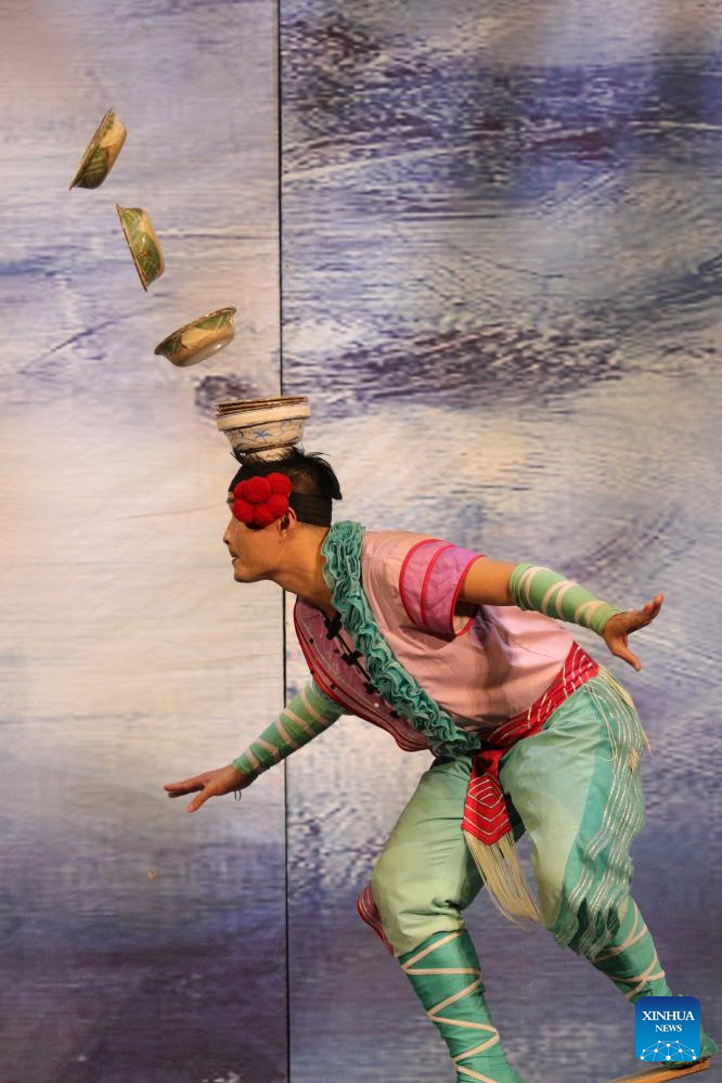 Acróbatas del Teatro de Arte Acrobático de Hunan, China, actúan durante el espectáculo acrobático "Viaje de ensueño" en el Teatro EDP Gran Vía en Madrid, España, el 3 de septiembre de 2023. La actuación número 700 de la gira mundial de "Viaje de ensueño" se llevó a cabo aquí el domingo. (Xinhua/Meng Dingbo)