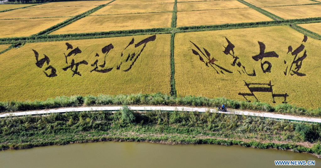 Creaciones artísticas elaboradas con plantas vivas en campo de arroz en Tai'an, Liaoning