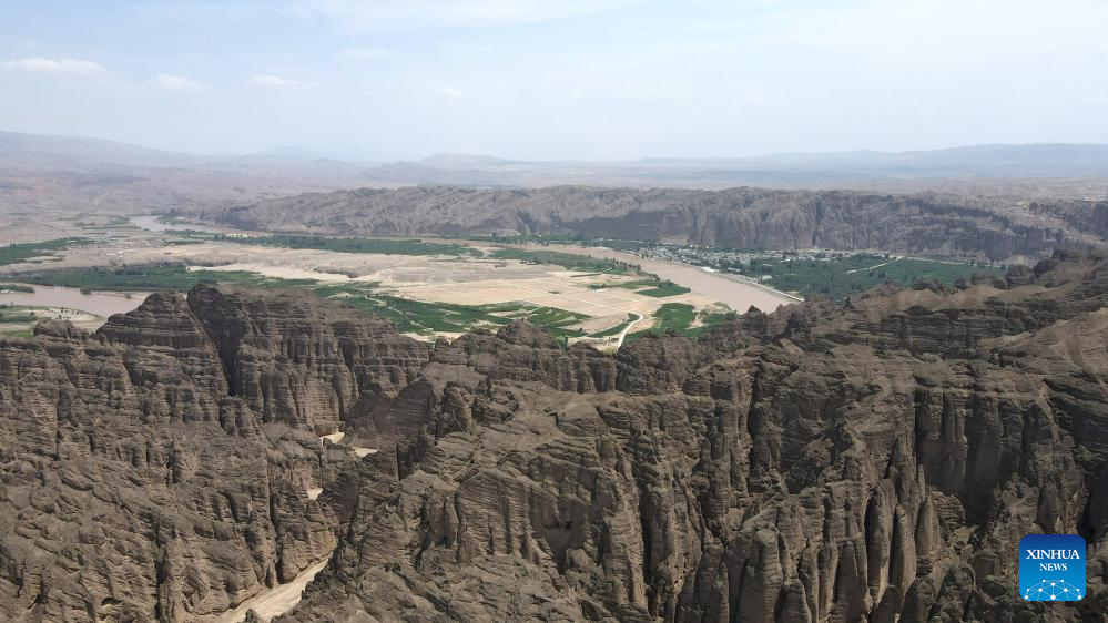 Esta foto aérea tomada el 11 de julio de 2023 muestra la aldea de Longwan y el Bosque de Piedra del río Amarillo en el distrito de Jingtai de la ciudad de Baiyin, provincia noroccidental china de Gansu.
