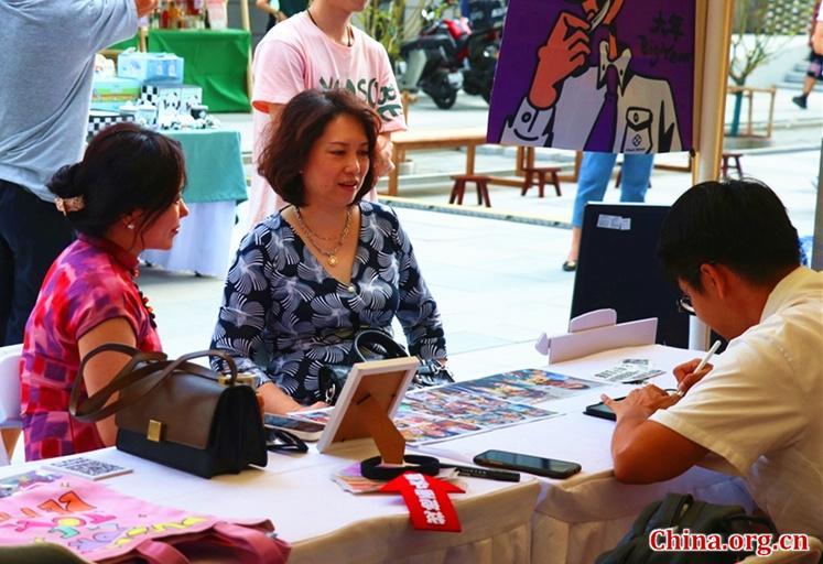 Un artista dibuja retratos para unas visitantes en un estand al aire libre en el área del Templo Longfu, distrito de Dongcheng, Beijing, el 15 de septiembre. [Foto de Wang Ziteng/China.org.cn]