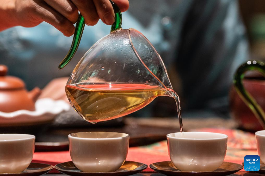 Una aldeana sirve té para los clientes en una fábrica de té de la montaña Jingmai en Pu'er, provincia de Yunnan, suroeste de China, el 14 de septiembre de 2023.