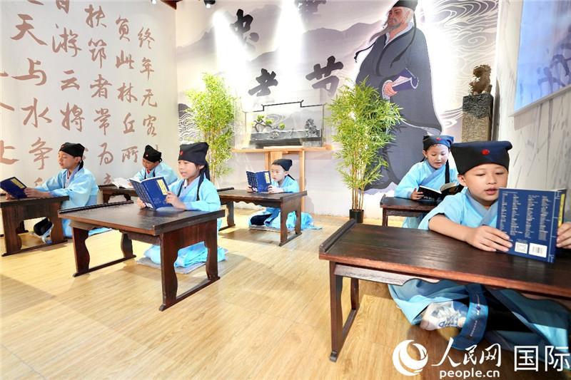 Estudiantes de primaria recitan "El Clásico de los Tres Caracteres" en voz alta en la Academia Haihui en la aldea de Daqiao, municipio de Beiliu, distrito de Yangcheng, provincia de Shanxi, norte de China. (People's Daily Online / Lu Pengyu)