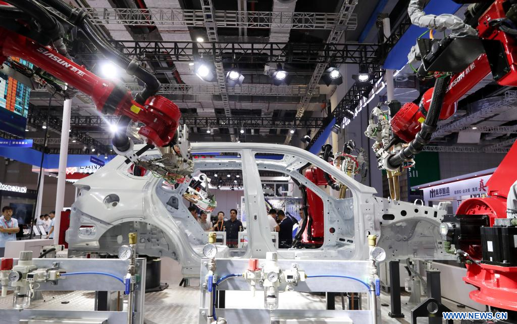 Visitantes observan a un robot soldar una carrocería de automóvil durante la 23ª Feria Internacional de la Industria de China (CIIF, por sus siglas en inglés), en Shanghai, en el este de China, el 19 de septiembre de 2023. La 23ª CIIF fue inaugurada el martes en Shanghai con el tema de "Economía Digital y Descarbonización industrial".