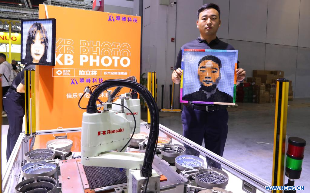 Un trabajador muestra su retrato hecho en bloques durante la 23ª Feria Internacional de la Industria de China (CIIF, por sus siglas en inglés), en Shanghai, en el este de China, el 19 de septiembre de 2023. La 23ª CIIF fue inaugurada el martes en Shanghai con el tema de "Economía Digital y Descarbonización industrial".