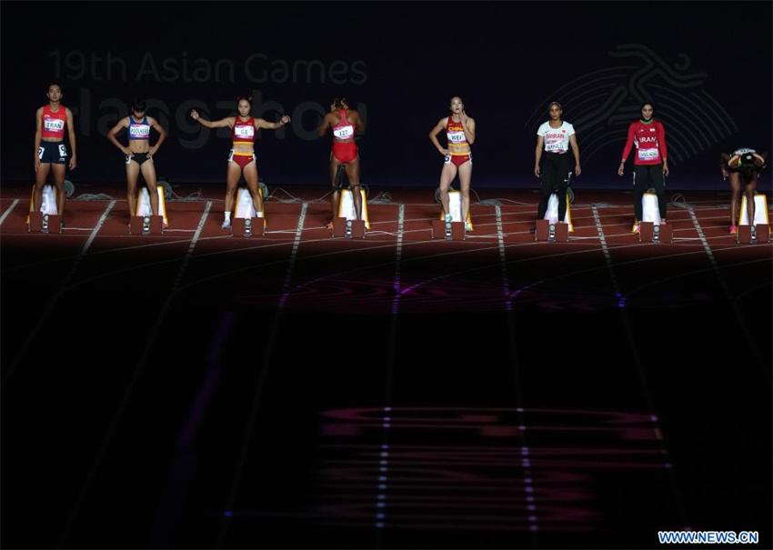 Ge Manqi (3-i), de China, reacciona previo a la final femenina de 100m de Atletismo en los XIX Juegos Asiáticos, en Hangzhou, en la provincia de Zhejiang, en el este de China, el 30 de septiembre de 2023. (Xinhua/Jiang Wenyao)