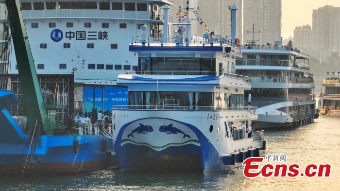 El primer barco propulsado por hidrógeno de China, el Barco de Hidrógeno No. 1 de las Tres Gargantas, atraca en el Centro Turístico de las Tres Gargantas en Yichang, provincia central china de Hubei, el 11 de octubre de 2023. (Foto/VCG)