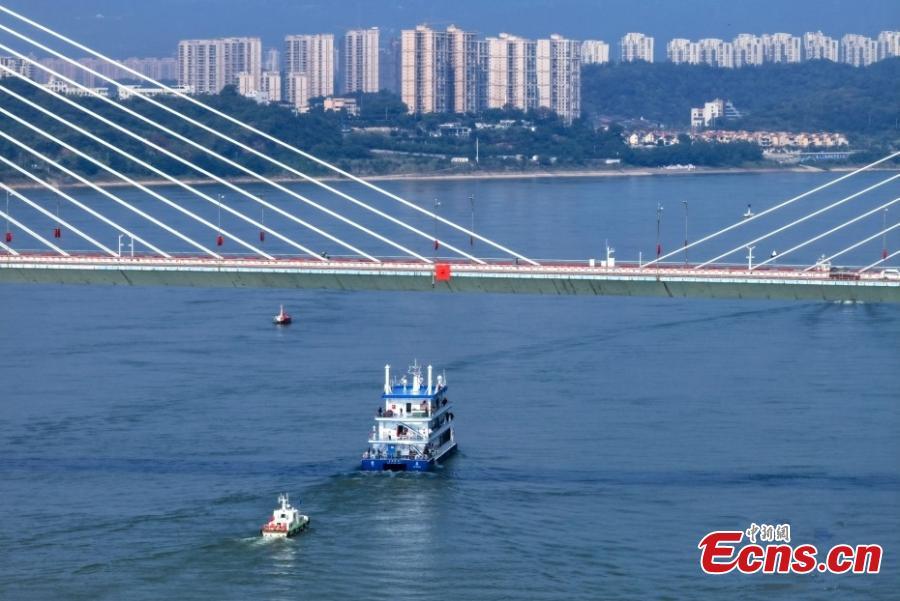 El primer barco propulsado por hidrógeno de China, el Barco de Hidrógeno No. 1 de las Tres Gargantas, parte desde el Centro Turístico de las Tres Gargantas en Yichang, provincia central china de Hubei, el 11 de octubre de 2023. (Foto/VCG)