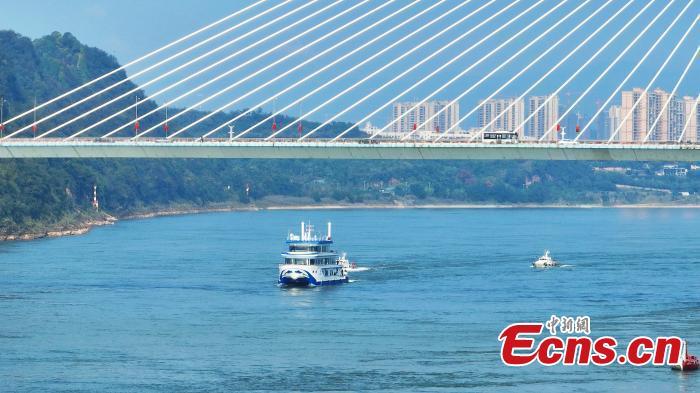 El primer barco propulsado por hidrógeno de China, el Barco de Hidrógeno No. 1 de las Tres Gargantas, parte desde el Centro Turístico de las Tres Gargantas en Yichang, provincia central china de Hubei, el 11 de octubre de 2023. (Foto/VCG)