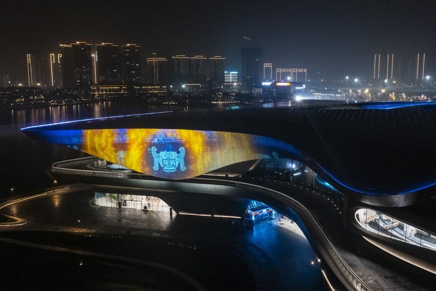 Esta foto aérea tomada el 16 de octubre de 2023 muestra una vista nocturna del Museo de Ciencias de Chengdu, sede principal de la 81ª Convención Mundial de Ciencia Ficción (WorldCon), en Chengdu, provincia de Sichuan, suroeste de China. (Xinhua/Shen Bohan)