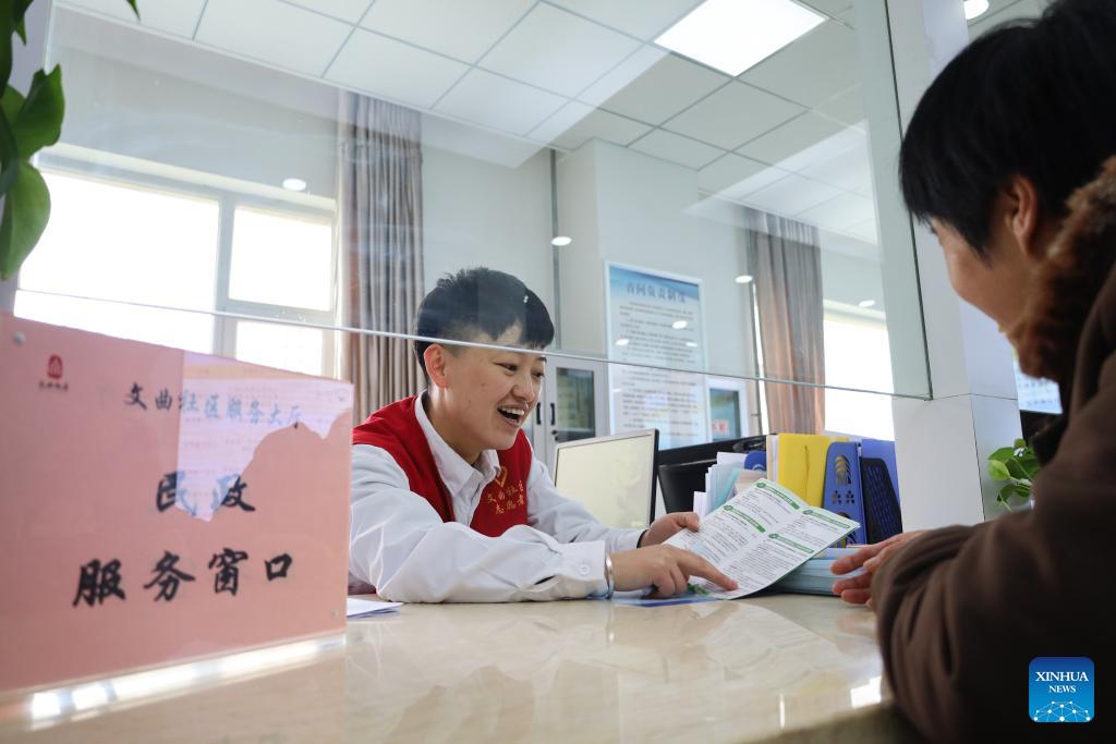 Un trabajador comunitario ayuda a un residente local en un mostrador de servicio en la Nueva Área de Lanzhou, en la provincia noroccidental china de Gansu, el 17 de octubre de 2023. En 2012, la Nueva Área de Lanzhou fue aprobada por el Consejo de Estado como la quinta zona de desarrollo económico especial a nivel nacional, siendo también la primera nueva área de desarrollo a nivel estatal en el noroeste de China.