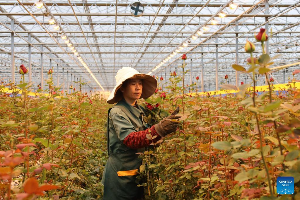 Una trabajadora cosecha rosas en la base de flores de un moderno jardín de demostración agrícola en la Nueva Área de Lanzhou, en la provincia noroccidental china de Gansu, el 17 de octubre de 2023. En 2012, la Nueva Área de Lanzhou fue aprobada por el Consejo de Estado como la quinta zona de desarrollo económico especial a nivel nacional, siendo también la primera nueva área de desarrollo a nivel estatal en el noroeste de China.