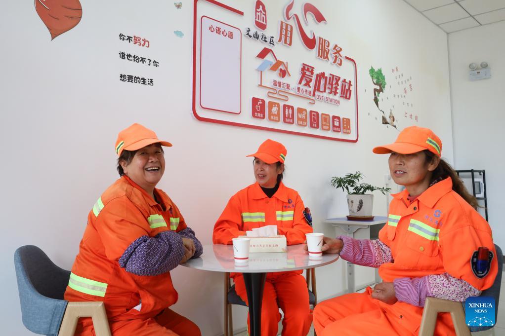 Trabajadoras de saneamiento descansan en una zona de ocio de una comunidad en la Nueva Área de Lanzhou, en la provincia noroccidental china de Gansu, el 17 de octubre de 2023. En 2012, la Nueva Área de Lanzhou fue aprobada por el Consejo de Estado como la quinta zona de desarrollo económico especial a nivel nacional, siendo también la primera nueva área de desarrollo a nivel estatal en el noroeste de China.