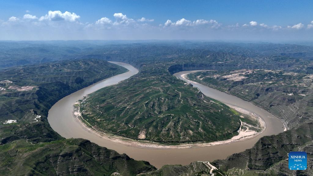 Esta foto aérea tomada el 3 de agosto de 2023 muestra una sección del río Amarillo en el distrito de Shilou, en la provincia de Shanxi, en el norte de China. El río Amarillo, el segundo río más largo de China, se origina en la meseta Qinghai-Tíbet y desemboca en el mar de Bohai desde la ciudad de Dongying. (Xinhua/Zhan Yan)