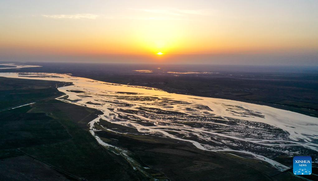 Esta foto aérea tomada el 15 de septiembre de 2023 muestra una sección del río Amarillo en la ciudad de Shuanghe, en el distrito de Linhe, en Bayannur, en la región autónoma de Mongolia Interior, en el norte de China. El río Amarillo, el segundo río más largo de China, se origina en la meseta Qinghai-Tíbet y desemboca en el mar de Bohai desde la ciudad de Dongying. (Xinhua/Lian Zhen)