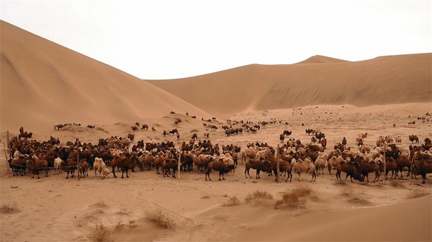 Los camellos crean una impresionante escena de trashumancia en el desierto de Badain Jaran