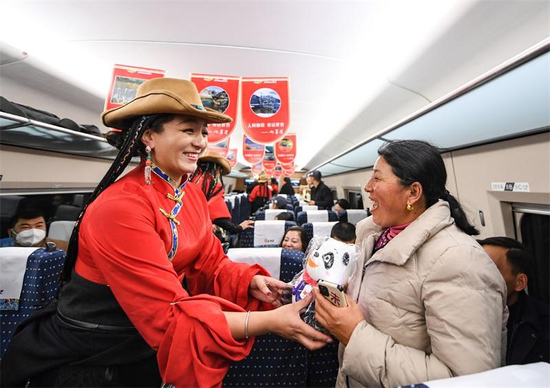 Una artista regala un recuerdo a una pasajera del primer tren de pasajeros de alta velocidad C6008 en un tramo del ferrocarril Sichuan-Qinghai, el 28 de noviembre de 2023. Un tramo de 238 kilómetros de la vía férrea Sichuan-Qinghai, en el oeste de China, entró en funcionamiento el martes tras 12 años de construcción. [Foto/Xinhua]
