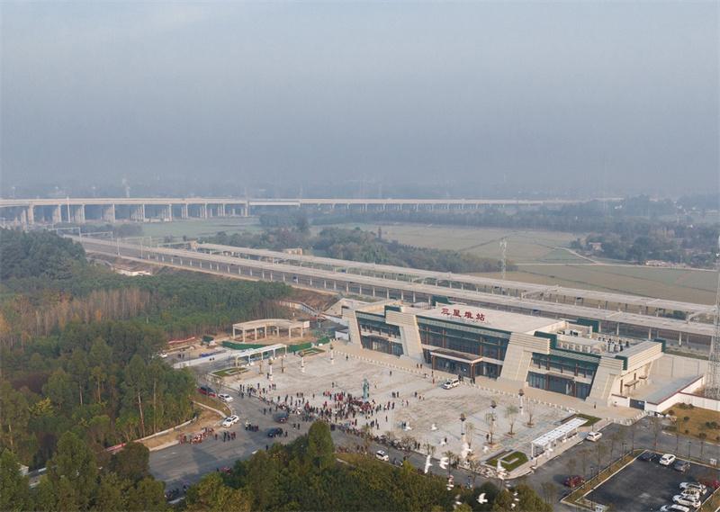 Esta foto aérea tomada el 28 de noviembre de 2023 muestra la estación de tren de Sanxingdui a lo largo de la línea de ferrocarril Sichuan-Qinghai en la provincia de Sichuan, en el suroeste de China. Un tramo de 238 kilómetros de la vía férrea Sichuan-Qinghai, en el oeste de China, entró en funcionamiento el martes tras 12 años de construcción. [Foto/Xinhua]