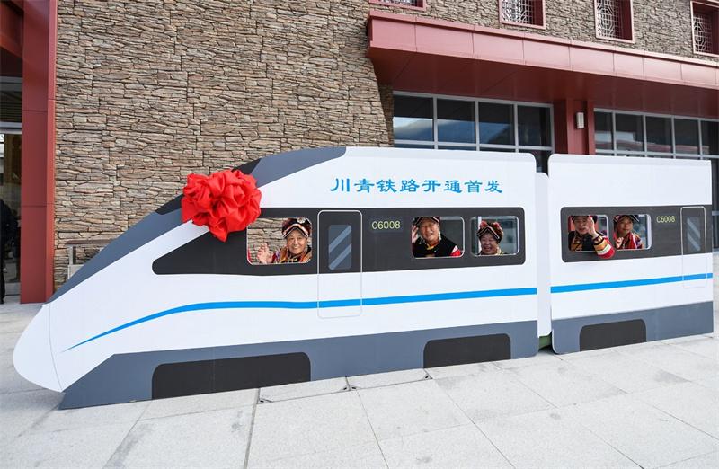 La gente posa para fotos durante la celebración de la inauguración de una sección del ferrocarril Sichuan-Qinghai en la estación de tren de Maoxian en el distrito de Maoxian, provincia de Sichuan, suroeste de China, el 28 de noviembre de 2023. Un tramo de 238 kilómetros de la vía férrea Sichuan-Qinghai, en el oeste de China, entró en funcionamiento el martes tras 12 años de construcción. [Foto/Xinhua]