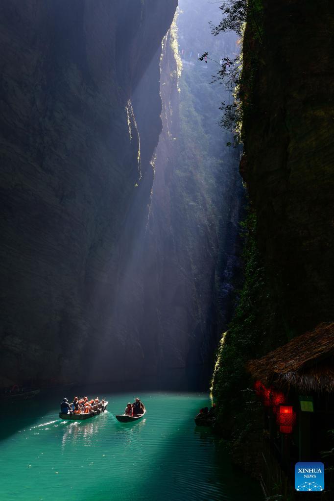Turistas disfrutan de la vista del cañón de Pingshan, una atracción turística famosa por sus aguas cristalinas, en el distrito de Hefeng, en la prefectura autónoma de las etnias miao y tujia de Enshi, provincia central china de Hubei, el 4 de diciembre de 2023. (Xinhua/Yang Wenbin.)