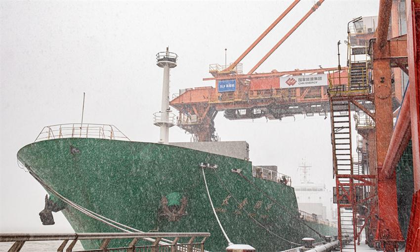 Un barco carga carbón térmico en el puerto de Huanghua en la ciudad de Cangzhou, provincia china de Hebei, 14 de diciembre de 2023. VCG