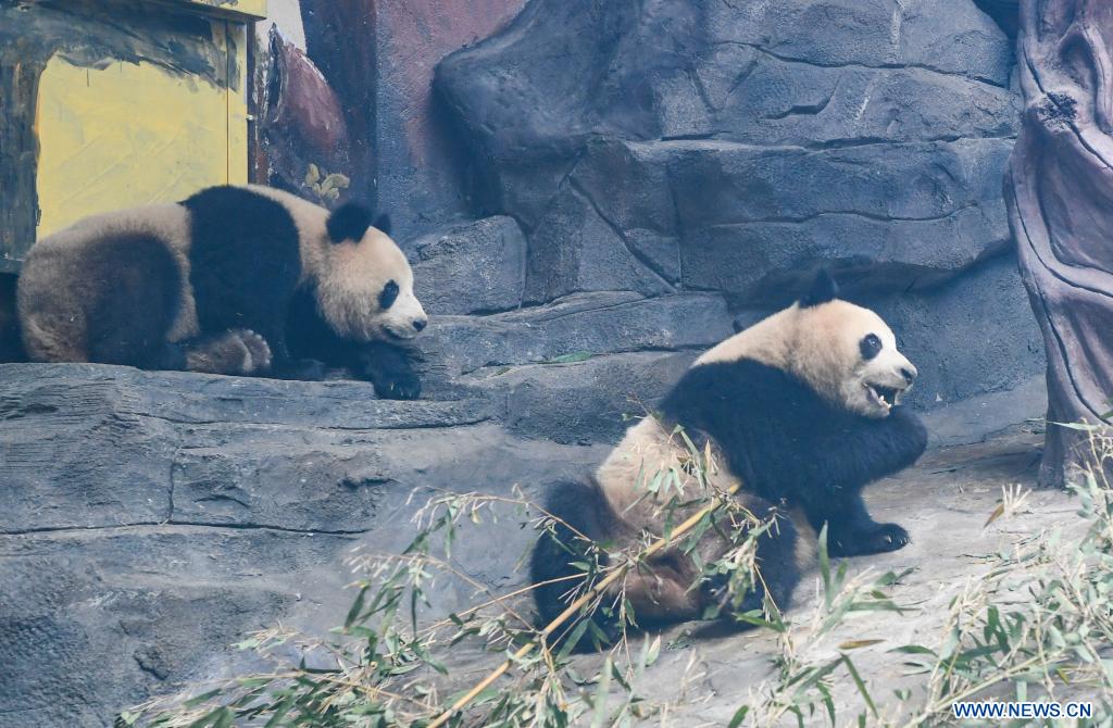 Los pandas gigantes Qing Hua (d) y Qing Lu son vistos en el parque temático de animales Locajoy, en el distrito de Yongchuan de la municipalidad de Chongqing, en el suroeste de China, el 3 de enero de 2024. Un total de 4 pandas gigantes, Qing Hua, Qing Lu, Qiao Yue y Ai Lian, han sido trasladados del Centro de Conservación e Investigación de Pandas Gigantes de China al parque temático de animales Locajoy, en Yongchuan de Chongqing. Los pandas gigantes se reunirán con el público tras un período de adaptación. (Xinhua/Wang Quanchao)