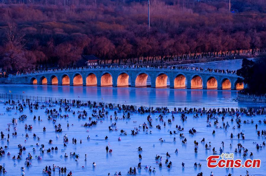 Los turistas se divierten en el lago Kunming, la pista de hielo natural más grande de Beijing, con la luz del sol brillante pasando a través de los arcos del Puente de 17 Arcos en el Palacio de Verano en Beijing, capital de China, el 14 de enero de 2024. (Foto: Servicio de Noticias de China/Zhang Wei.)