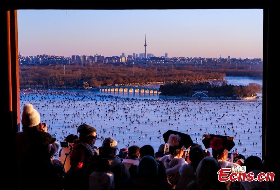 Los turistas se divierten en el lago Kunming, la pista de hielo natural más grande de Beijing, con la luz del sol brillante pasando a través de los arcos del Puente de 17 Arcos en el Palacio de Verano en Beijing, capital de China, el 14 de enero de 2024. (Foto: Servicio de Noticias de China/Zhang Wei.)