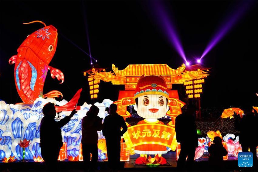 La gente visita una feria de faroles en la ciudad de Caocun de Ruian, en la provincia oriental china de Zhejiang, el 13 de enero de 2024. (Foto de Zhuang Yingchang/Xinhua.)