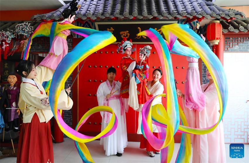 Artistas de una una compañía de títeres ensayan en Laixi, en la provincia oriental china de Shandong, el 14 de enero de 2024. (Foto de Zhang Jingang/Xinhua.)