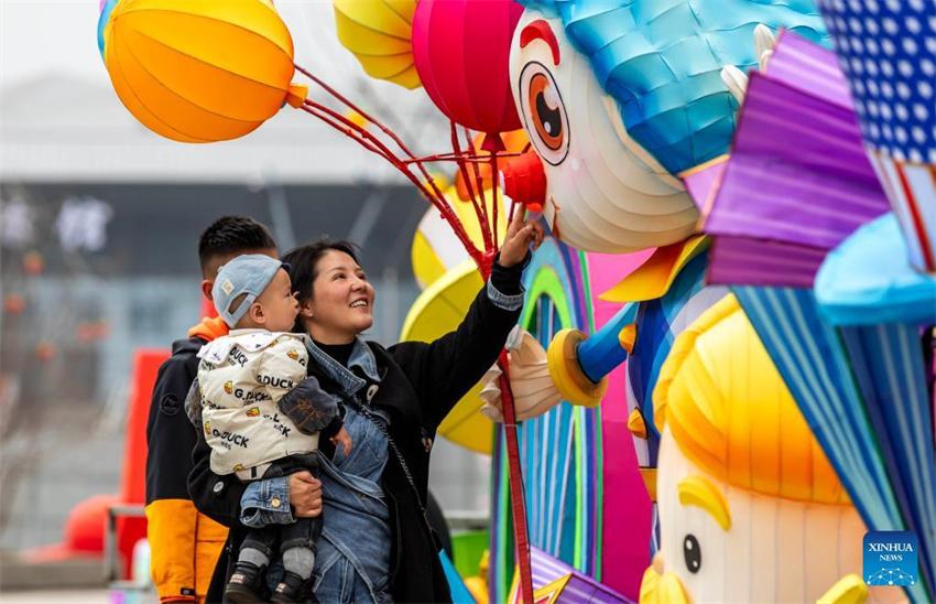 Una familia observa los faroles en un centro deportivo en la ciudad de Qianxi, provincia suroccidental china de Guizhou, el 14 de enero de 2024. (Foto de Fan Hui/Xinhua.)