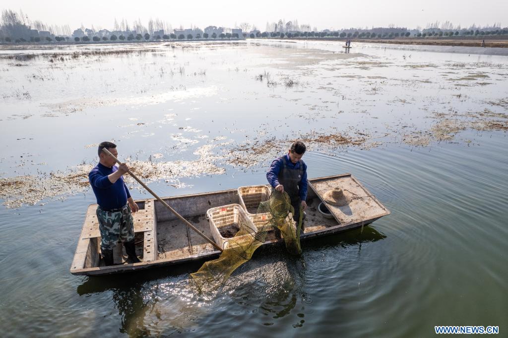 Agricultores cosechan cangrejos de río en una base de crianza en Yiyang, Hunan