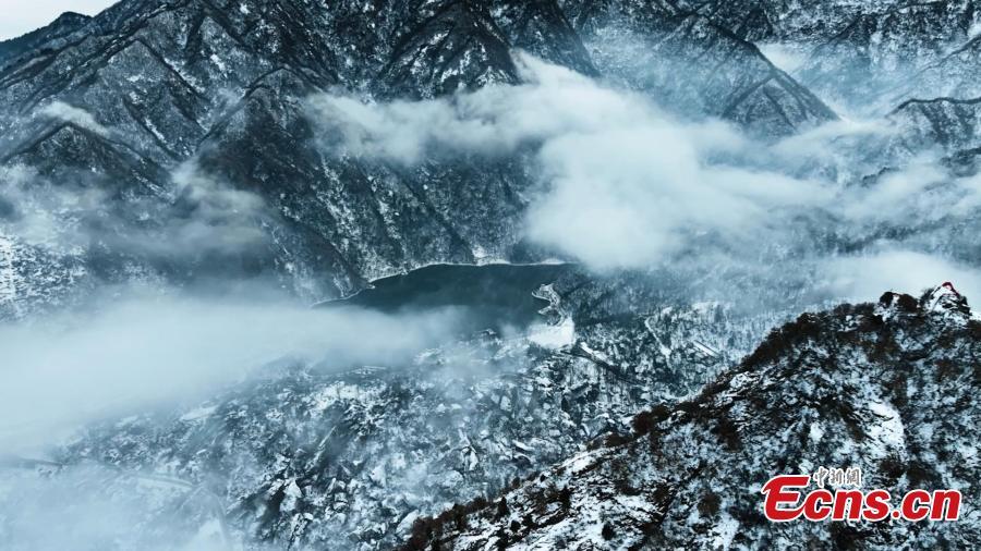 Las montañas Qingling aparecen cubiertas por la primera nevada de 2024 con nubes flotando sobre sus picos en la provincia noroccidental china de Shaanxi, el 15 de enero de 2024. (Foto proporcionada a China News Service.)
