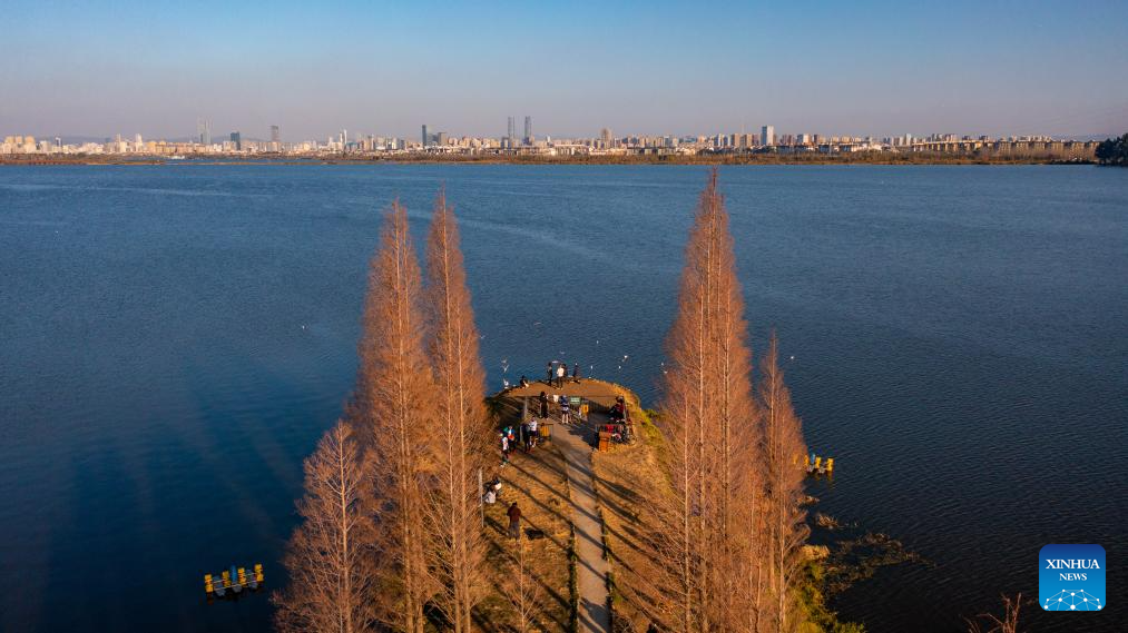 Una foto aérea tomada con un dron el 13 de enero de 2024 muestra a turistas disfrutando del paisaje junto al lago Dianchi en Kunming, provincia suroccidental china de Yunnan. La calidad general del agua del lago Dianchi se ha mantenido durante seis años consecutivos desde que alcanzó la Clase IV en el sistema de evaluación de cinco niveles del país por primera vez en 2018. (Xinhua/Hu Chao.)
