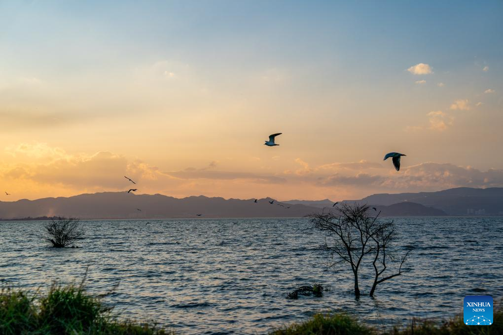 Esta foto tomada el 15 de enero de 2024 muestra una vista del lago Dianchi en Kunming, provincia suroccidental china de Yunnan. La calidad general del agua del lago Dianchi se ha mantenido durante seis años consecutivos desde que alcanzó la Clase IV en el sistema de evaluación de cinco niveles del país por primera vez en 2018. (Xinhua/Hu Chao.)