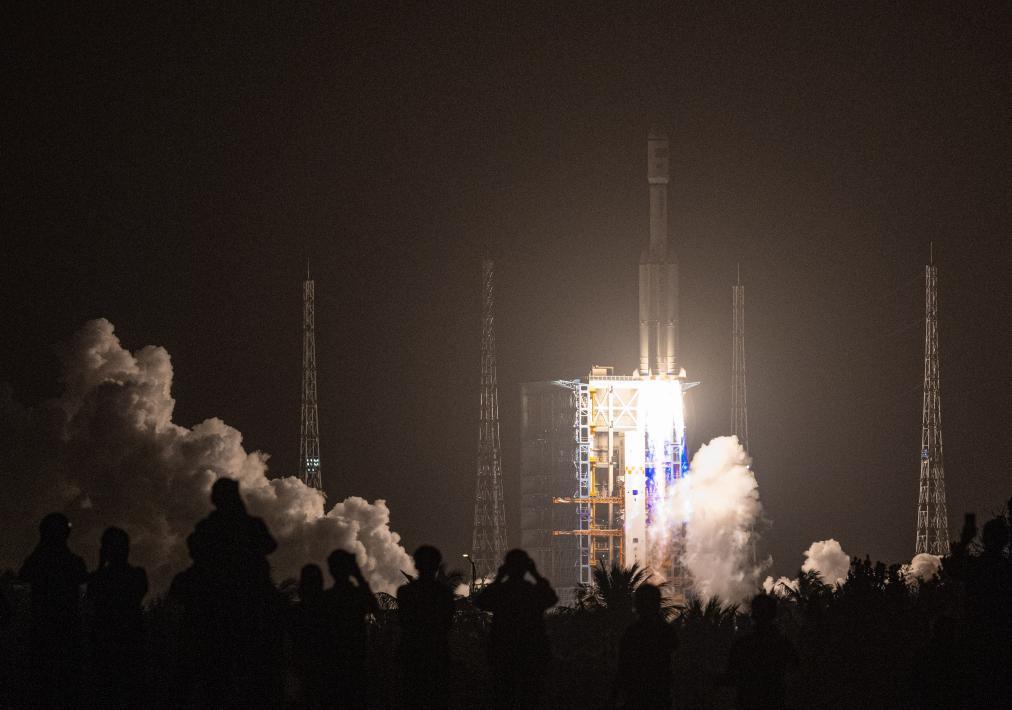 Personas observan cómo un cohete portador Gran Marcha-7 Y8 que transporta la nave espacial de carga Tianzhou-7 despega desde el centro de lanzamiento de naves espaciales de Wenchang, en la provincia de Hainan, en el sur de China, el 17 de enero de 2024. (Xinhua/Pu Xiaoxu)