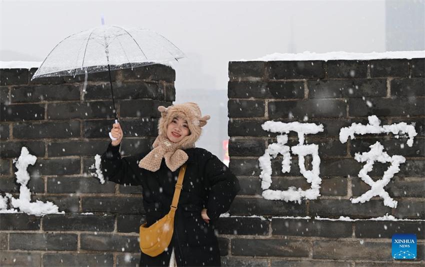 Una turista disfruta del paisaje nevado en la antigua muralla de la ciudad cubierta de nieve en Xi'an, provincia noroccidental china de Shaanxi, el 16 de enero de 2024. (Xinhua/Liu Xiao.)
