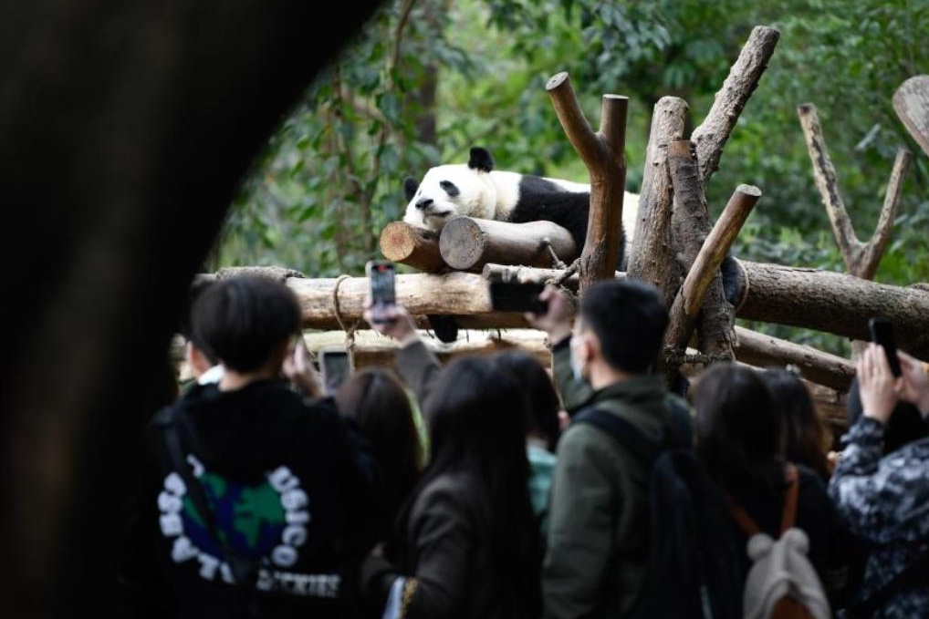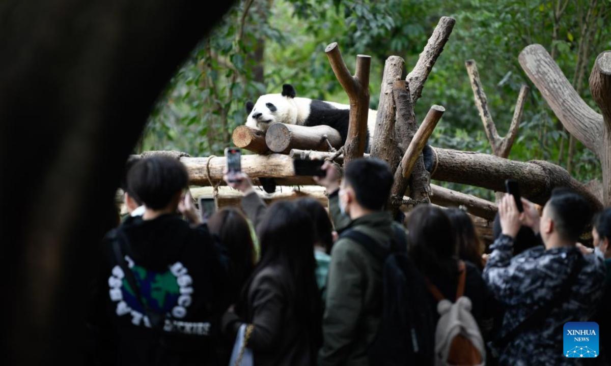 Visitantes toman fotos mientras He Ye duerme la siesta en la Base de Investigación para la Cría del Panda Gigante de Chengdu, provincia suroccidental china de Sichuan, 22 de marzo de 2023. Xinhua
