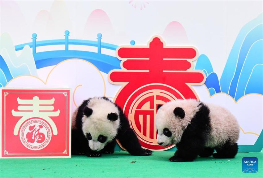 Cachorros de panda gigante vistos en la base Shenshuping del Centro de Conservación e Investigación de Pandas Gigantes de China en Wolong, provincia suroccidental china de Sichuan, el 4 de febrero de 2024. Un total de 34 cachorros de panda gigante fueron criados por el Centro de Conservación e Investigación de Pandas Gigantes de China y la Base de Investigación de Cría de Pandas Gigantes de Chengdu en 2023. (Foto de Li Chuanyou/Xinhua.)