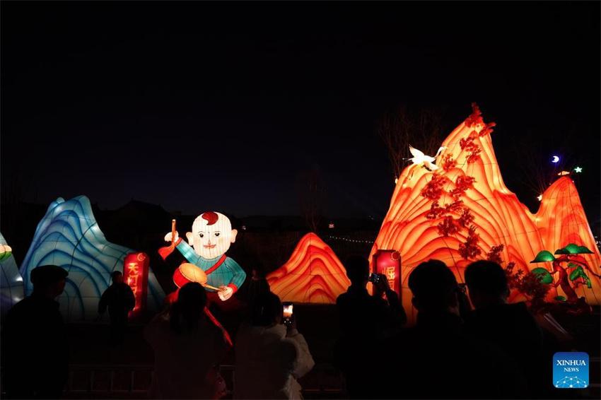 La gente visita un espectáculo de faroles celebrado en el lugar escénico del distrito antiguo de Taiyuan en Taiyuan, provincia de Shanxi, en el norte de China, el 16 de febrero de 2024. (Xinhua/Zhan Yan.)