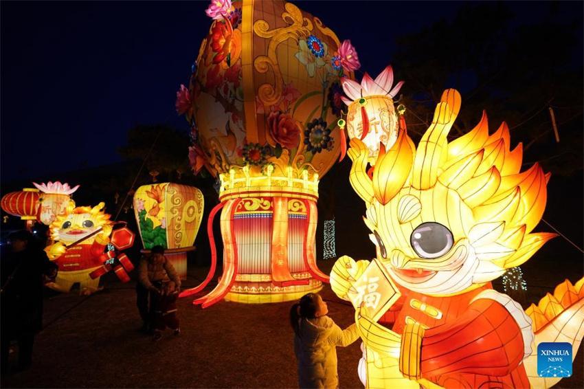 La gente visita un espectáculo de faroles celebrado en el lugar escénico del distrito antiguo de Taiyuan en Taiyuan, provincia de Shanxi, en el norte de China, el 16 de febrero de 2024. (Xinhua/Zhan Yan.)