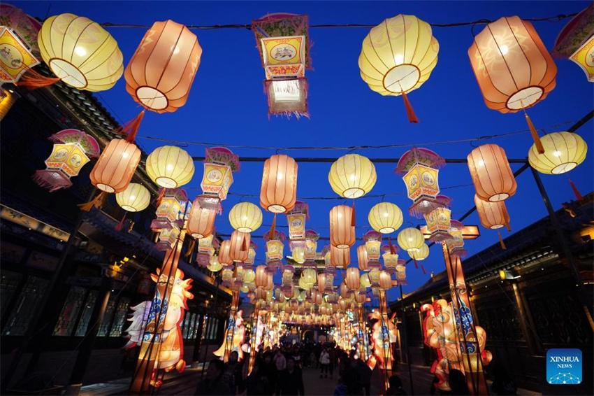 Esta foto tomada el 16 de febrero de 2024 muestra un espectáculo de linternas celebrado en el lugar escénico del antiguo condado de Taiyuan en Taiyuan, provincia de Shanxi, en el norte de China. (Xinhua/Zhan Yan.)