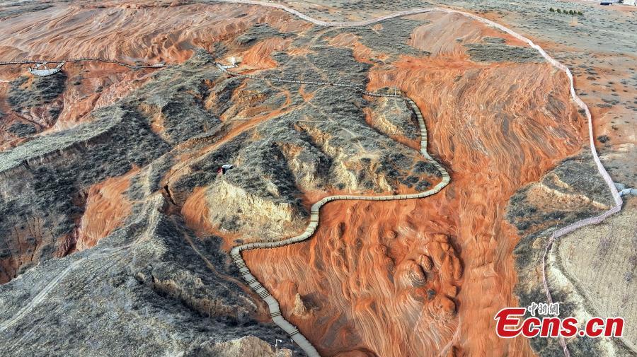 El primer plano de las rocas estratificadas del accidente geográfico de Danxia, un paisaje caracterizado por la arenisca rojiza, en la ciudad de Longzhou del distrito de Jingbian, provincia noroccidental china de Shaanxi, el 5 de marzo de 2024. (Foto/VCG.)