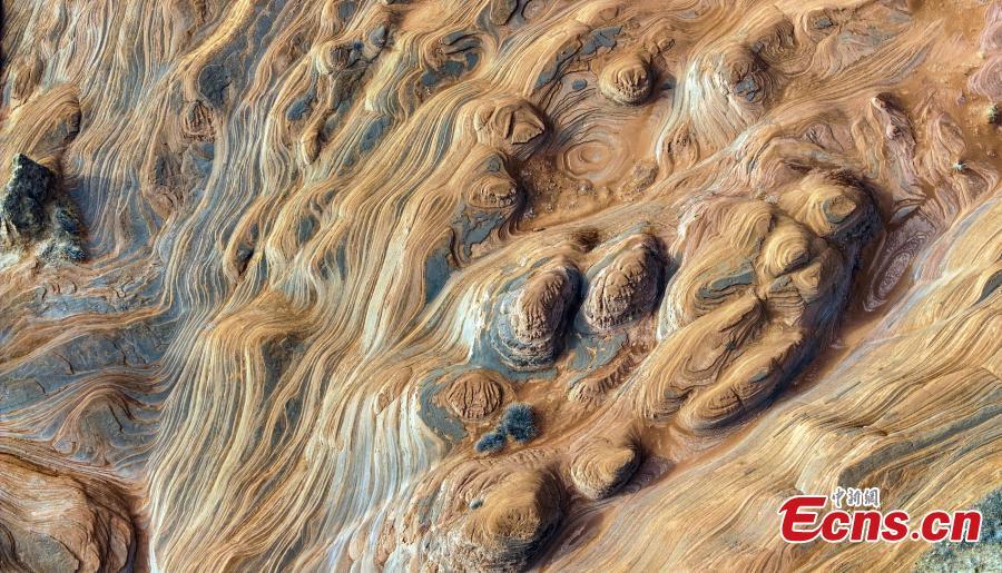 El primer plano de las rocas estratificadas del accidente geográfico de Danxia, un paisaje caracterizado por la arenisca rojiza, en la ciudad de Longzhou del distrito de Jingbian, provincia noroccidental china de Shaanxi, el 5 de marzo de 2024. (Foto/VCG.)
